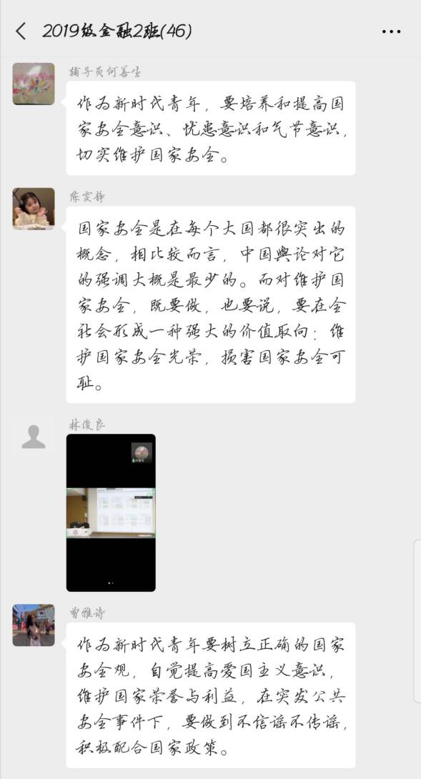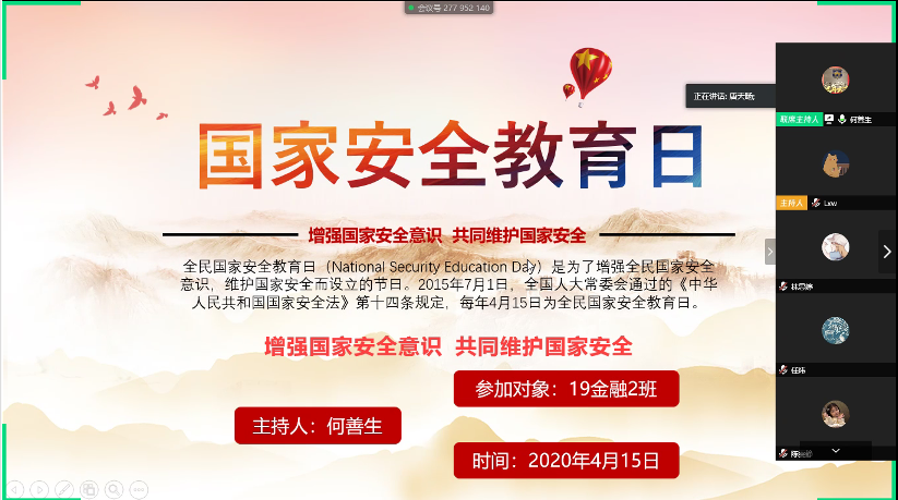 为了让同学们进一步了解国家安全知识,2020年4月15日上午10点整,行政秘书兼辅导员何善生老师组织会计与金融学院(SAF)2019级金融(2)班全体同学在线上开展了“坚持总体安全观,统筹传统安全和非传统安全”为主题的班会。