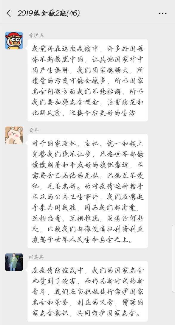 在观看公开课的过程中,同学们对于国家安全有了更深层次的理解,并在微信群里开展了激烈的讨论。很多同学表示在讨论的过程中,他们的学习达到了事半功倍的效果。
