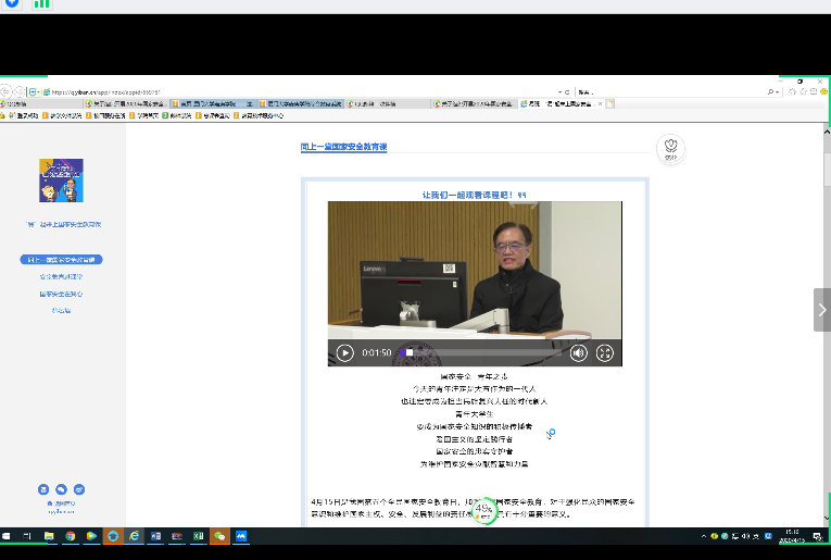 为了营造维护国家安全的浓厚法治氛围,增强防范和抵御安全风险能力,今天下午15:00-16:00期间在黄秀梅辅导员的带领下一起收看了由公共安全领域专家、中国工程院院士范维澄主讲的国家安全教育课。
