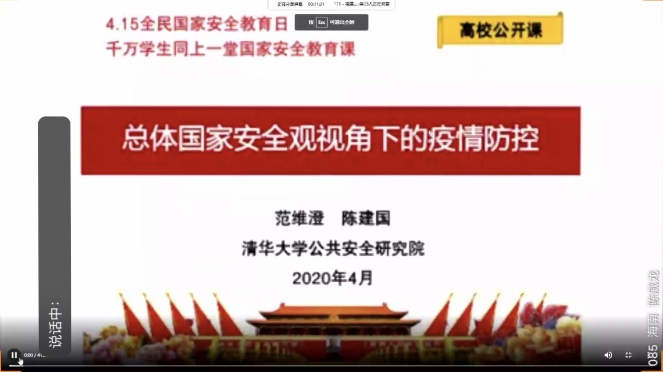 接着,全班同学共同观看“同上一堂国家安全教育课”的高校公开课。该公开课由清华大学公共安全研究院的范维澄教授和陈建国教授主持,讲述总体国家安全观视角下的疫情防控。2020伊始,新冠病毒将魔爪伸向中华大地,社会恐慌带来的是对国家安全的威胁。但在此期间,国防动员系统众志成城,坚决贯彻落实党中央、中央军委和习主席决策部署,敢打硬仗,主动作为,交出一份份沉甸甸的战“疫”答卷。疫情的全球大流行对世界经济环境、政治环境、产业环境、公关活动等各个方面都造成了巨大的冲击,疫情缓解后我国仍面临机遇与挑战并存的局面,因此,我国要坚持总体国家安全观,统筹做好发展与安全两件大事,贯彻人才强国战略,积极推进国家安全学科建设。