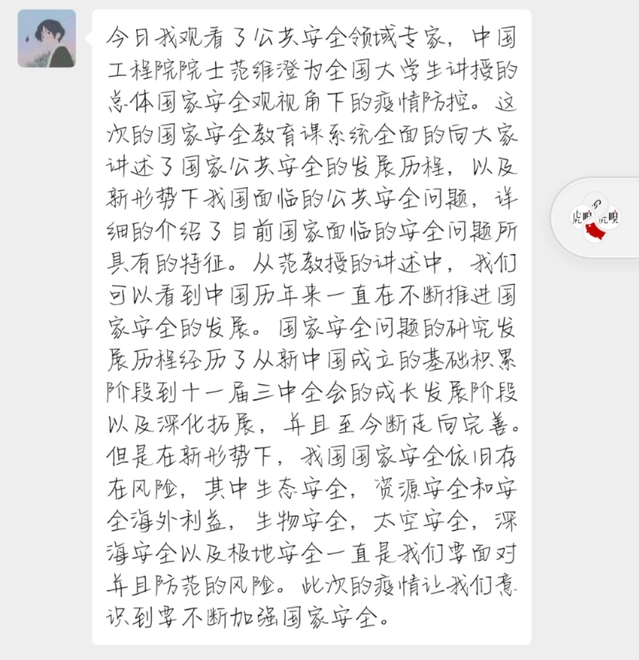 课程结束后,同学们积极地分享了自己对当前国家安全新形势的看法和感悟。