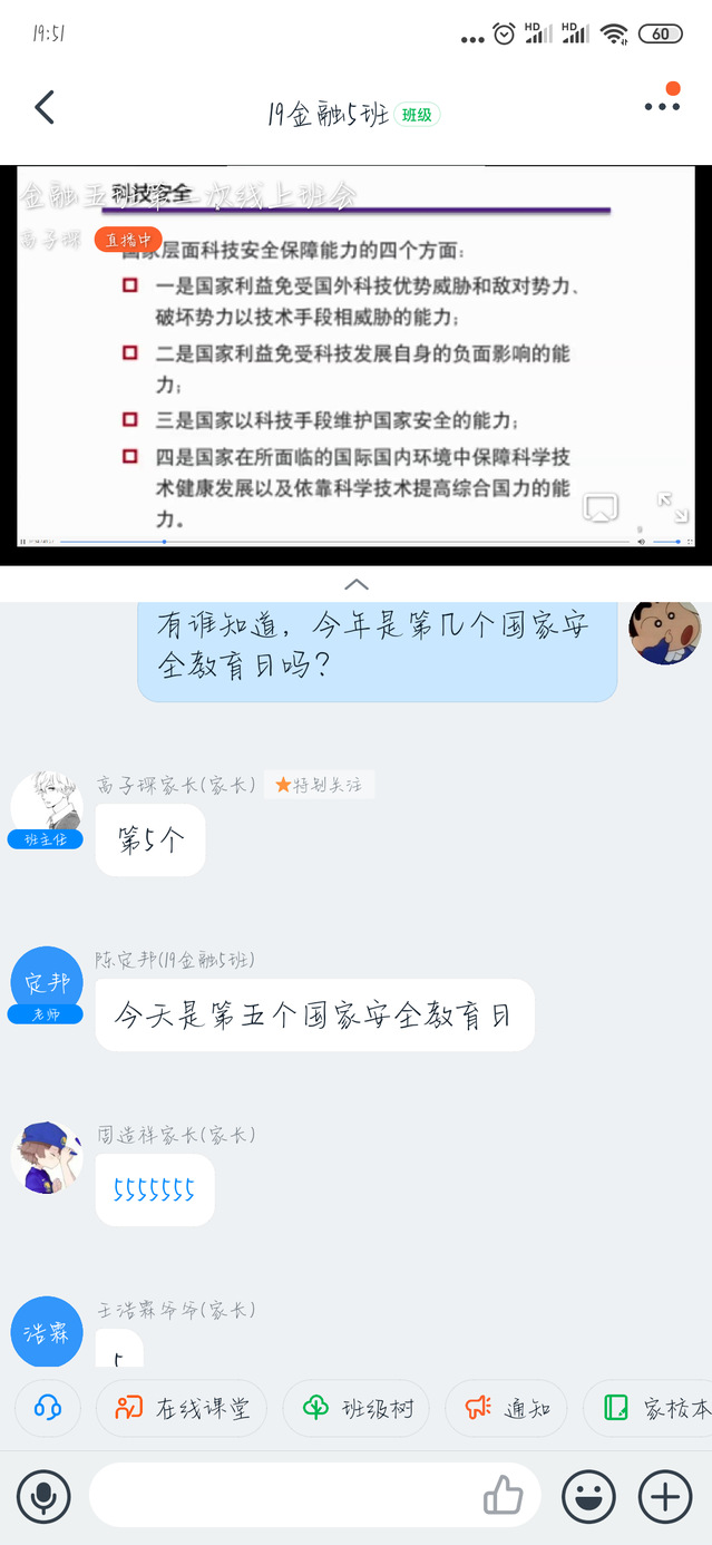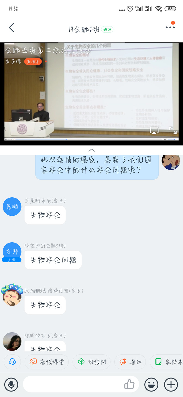 为了响应国家教育引导广大青年学生牢固树立国家安全意识,提升维护国家安全能力的号召,2019级金融5班于4月15日晚上19:00组织全班同学一同参与以“总体国家安全观视角下的疫情防控”为课程主题的“同上一堂国家安全教育课”活动。