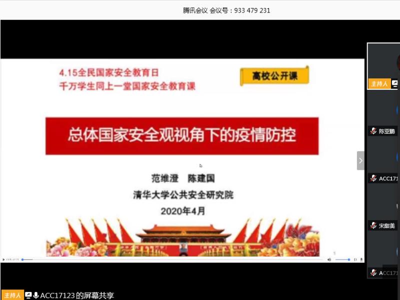 2020年4月15日是第5个全民国家安全教育日,为了提高全民国家安全法治意识,营造维护国家安全的浓厚法治氛围,增强防范和抵御安全风险能力。在陈亚鹏辅导员的带领下,2017级会计3班全体同学,于4月15日下午共同观看了由公共安全领域专家、中国工程院院士范维澄所主讲的,以总体国家安全观视角下的疫情防控为主题的安全教育课。