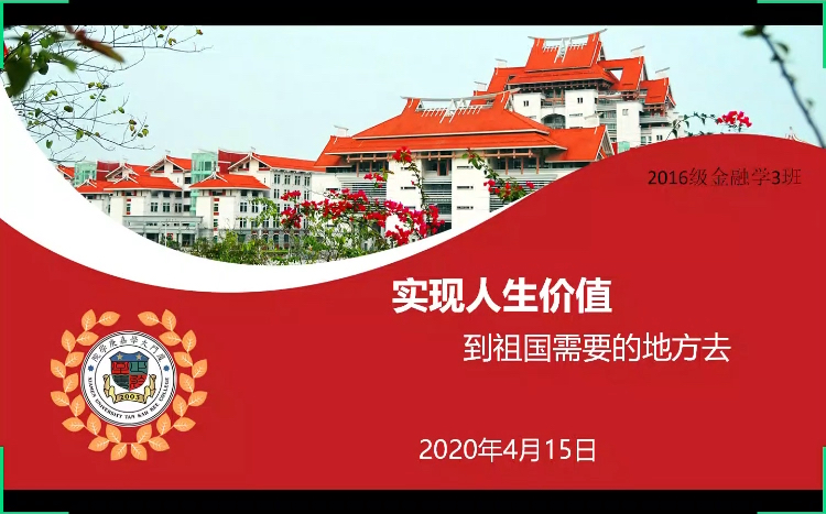 随着毕业脚步的临近,同学们逐渐找到了各自的方向,但也有一部分同学还在迷茫中摸索前进.为了给大家提供更多的帮助,2016级金融(3)班于4月15日晚上举行“实现人生价值,到祖国需要的地方去”线上主题班会,全体同学准时参加,辅导员甘友成老师亲自担任主讲,原班级辅导员助理、留学归国学姐尤镔瑜以及本班韩墨同学为我们分享了校招经验。