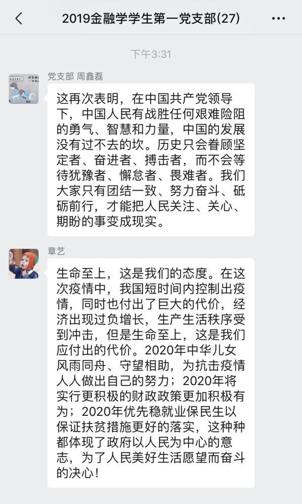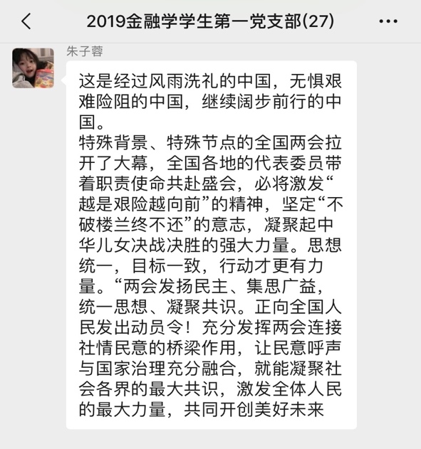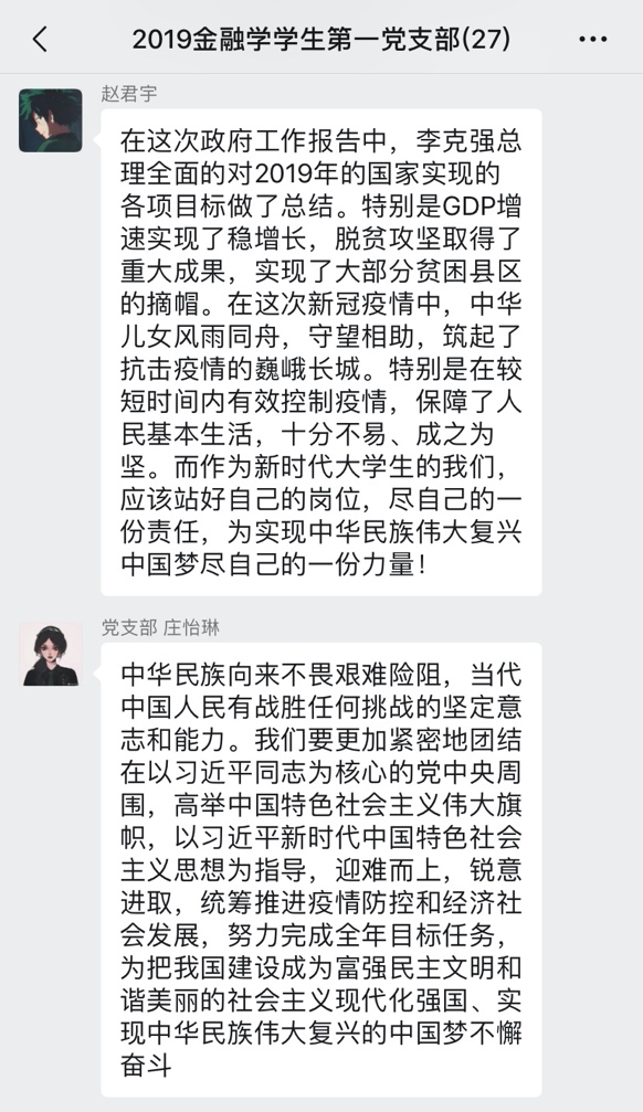 2020年5月22日,十三届全国人大三次会议在北京人民大会堂开幕,国务院总理李克强作政府工作报告,李克强总理对去年工作进行回顾,提出今年重要目标和今年部分重要工作。金融学学生第一党支部于5月22日集中观看学习了李克强总理工作报告,支部党员在线上开展了激烈讨论,分享了自己的观感,本次会议由支部陈忆伦同志主持,支部书记何善生同志做最终总结。