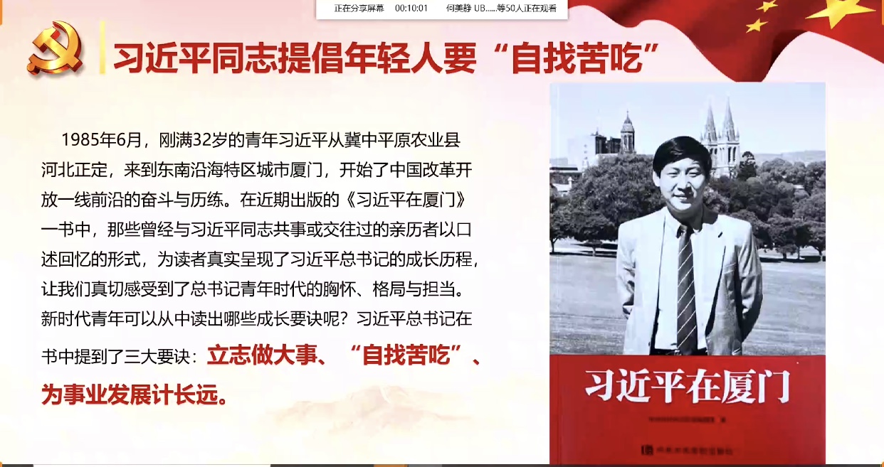 2018级会计(5)班团支部于5月27日下午14时30分,通过线上QQ班务群屏幕分享的方式,进行了线上的微团课,当天一共53名同学参与其中,本次活动用“习近平邀请我们返家乡搞农村调研”、“习近平与我们聊如何做好基层工作”、“习近平同志提倡年轻人要自讨苦吃”、“习近平总书记给闽东大学生们的回信内容”四部分内容以及对于中国梦的阐述,让全体同学很好地学习到了习近平总书记做青年朋友的知心人,热心人,领路人。