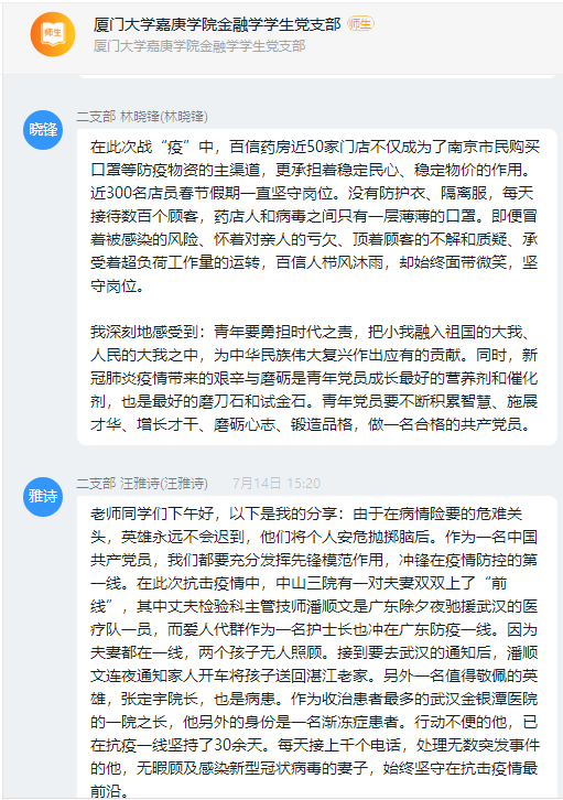 根据厦门大学嘉庚学院庆祝中国共产党成立99周年活动方案,深入贯彻基层党组织常态化疫情防控“四个一”行动重点说明,深入学习在疫情防控中涌现出的先进人物事迹和感人故事,7月14日,会计与金融学院金融学学生党支部在钉钉平台通过线上直播的形式举行“战疫故事”专题组织生活会,本次组织生活会主要围绕“战疫故事”交流思想,总结经验,对照先进典型查摆自身差距,是一场特殊的专题组织生活会,没有互相批评和民主评议党员等程序。金融学党建指导老师何善生主持会议。