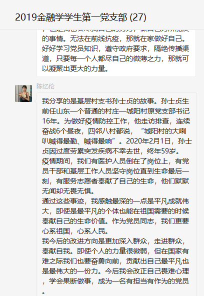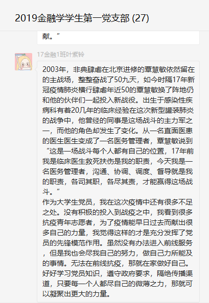 张桢源说,“ 沧海横流方显本色。在我心目中,为武汉捐款的清洁工、主动站岗的志愿者、志愿接送医护人员的出租车司机等普通人,都是了不起的英雄,他们在平凡的岗位上为祖国做出了不平凡的贡献。我们身为学生党员,更应该向他们学习,牢固树立奉献和服务精神,为疫情防控作出绵薄贡献。”