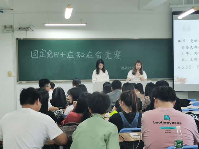 本次竞赛由2018级税收专业的张燕斓同学和夏雨轩同学共同主持。竞赛设置20道题,其中包括填空题,单选题和多选题。支部党员、预备党员和积极分子分成四组,每组派出10人,每人回答两题,进行十轮积分抢答制比赛。