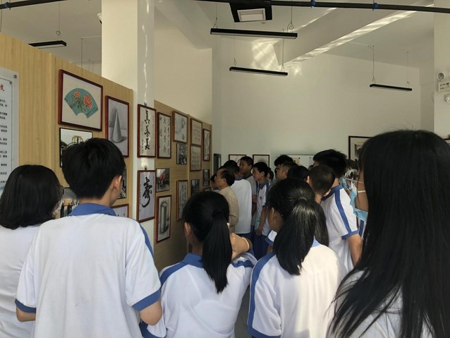 活动的第四项内容,由老年大学书画指导洪桥恩老师带领大家参观凌波社区老年书法、绘画作品。老年大学学员多数是古稀老人,勤学善学的老人们有的只上了两个课时,就能创造出如此精湛的作品,可谓是“老骥伏枥志千里,笔耕不辍再辉煌”。洪桥恩老师在讲解作品时,还向同学生们讲述了在指导爷爷奶奶们作画过程的有趣之事,并向学生们提倡要珍惜现下,把握学习机会,用一己之力在现在与将在为祖国的建设奉献出一份力量!