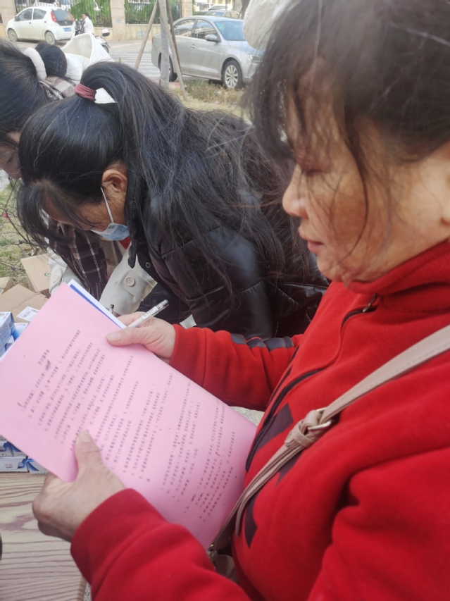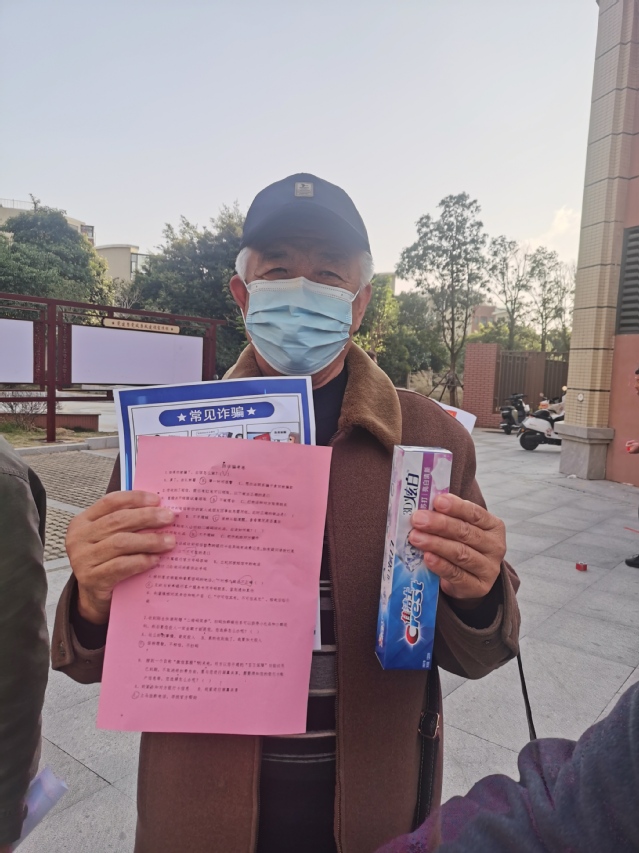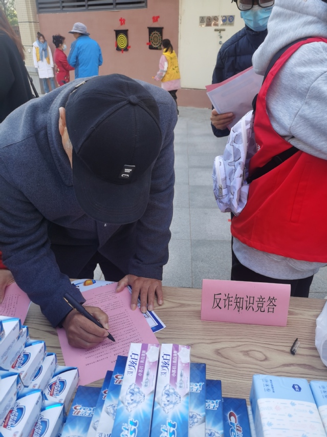 活动开始前期,党支部内部经过集体商讨、分工协作,提前准备充足的物资,例如宣传海报、问卷、牙膏、纸巾、肥皂等等。从遇到各种诈骗方式时如何应对着手设计问题制成问卷,再由居民进行答题,最后由志愿者进行批改并指出其错误。志愿者们在引导群众完成试题问卷的同时也为群众普及了防诈骗知识。