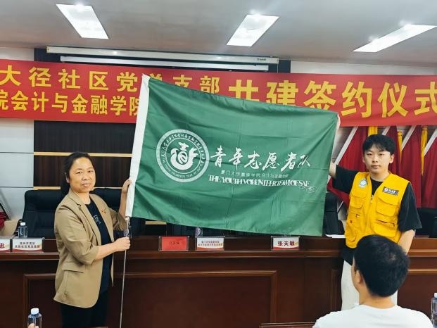 随后,漳州开发区大径社区党总支副书记桂菊香为我院青年志愿者队授旗,旨在进一步倡导志愿服务文化,增强青年志愿者服务动力,充分发挥高校社区服务职能,确保共建工作落到实处、见到实效。