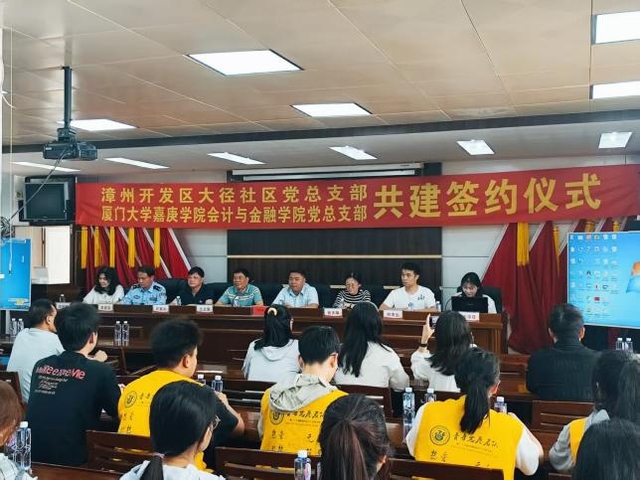 为深化校社合作,推动资源共享和高质量党建工作,促进社区可持续发展,同时强化大学生社会服务意识,为师生搭建实践育人的平台,最终实现教育价值与社会价值的双向赋能,会计与金融学院党总支与大径社区党总支党建共建签约仪式于2025年4月18日上午10时在大径社区党群服务中心二楼会议室举行。漳州开发区社会发展局党委副书记兰立强、我院党总支书记甘友成、漳州开发区大径社区党总支书记许爱忠、南太武中心派出所社区民警韩建安、教工第二党支部书记张天敏、我院学生党支部书记何善生、罗欢、龚学峰、郑永方和我院团委团务中心指导老师陈守峰、青年志愿者队指导老师刘兆莉以及双方代表共计50多人出席本次会议。